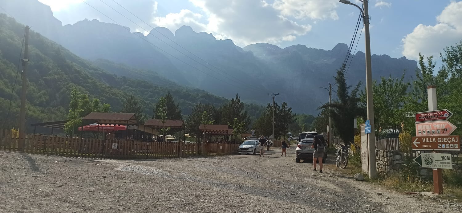 The drop-off point is just a dirt road, kind of a meeting place with a few stalls and jeeps around. It has this easy, outdoor vibe, like a surfer’s spot but for mountain lovers and trekkers. There is a little cafe and some toilets. The village itself is a little tucked away. From the bridge, entering Theth you have to walk a bit to reach the well-known church, passing little paths and wooden fences, with the mountains all around you. It's a peaceful town, with a few guesthouses serving coffee and homemade food.